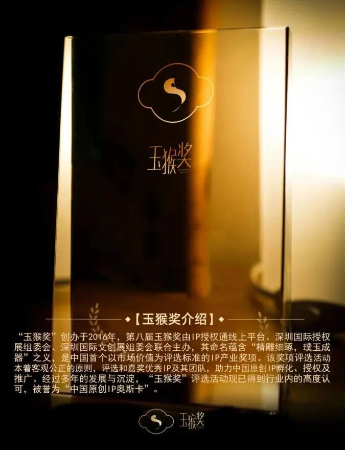 “玉猴奖”(JADE MONKEY AWARDS)创办于2016年,其命名蕴含“精雕细琢,璞玉成器”之义,是中国第一个以市场价值为评选标准的IP产业奖项。经过多年的发展与沉淀,“玉猴奖”现已得到业内的高度认可,被誉为“中国原创IP奥斯卡”。